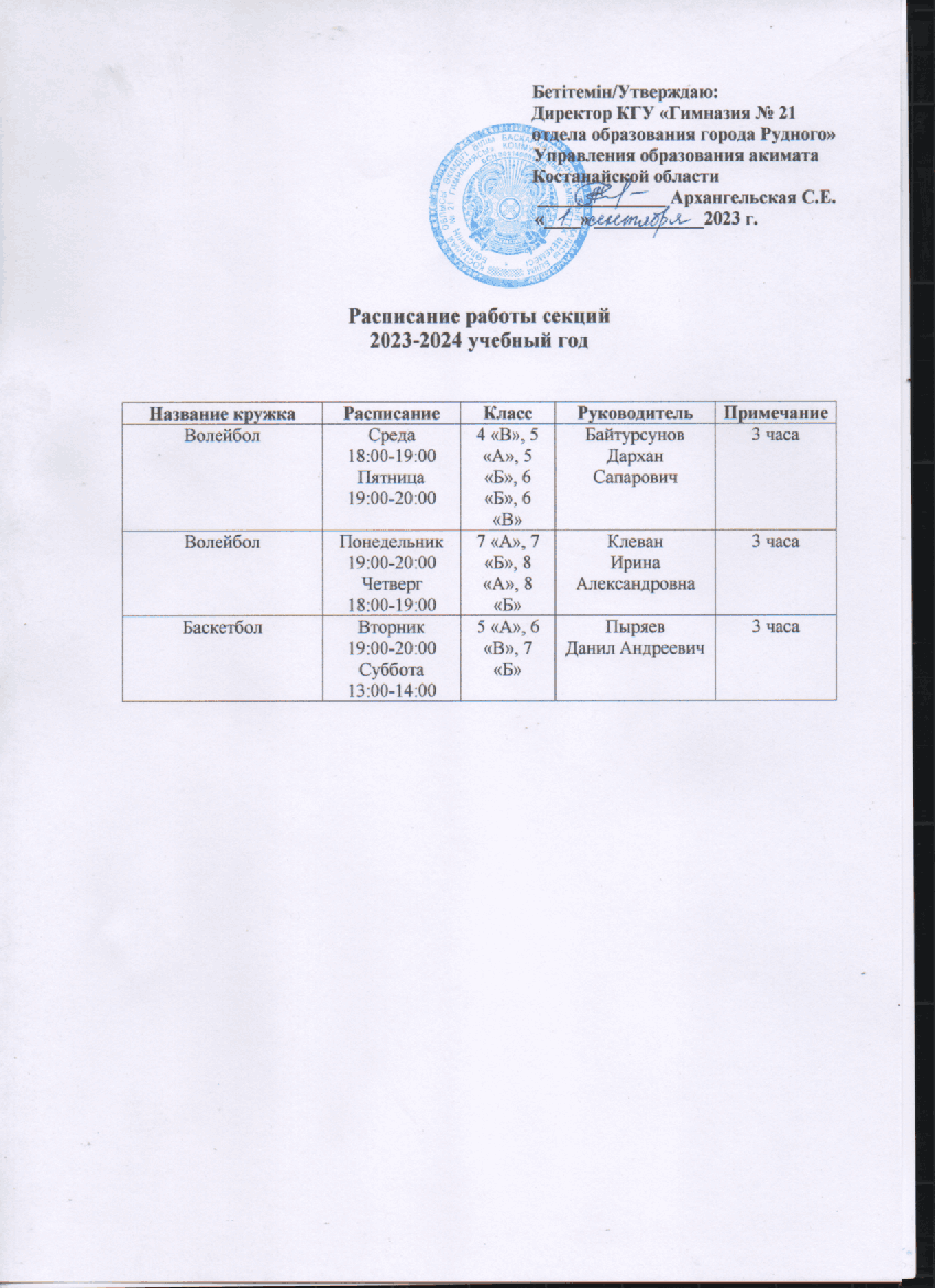 Расписание спортивных секций на 2023 - 2024 учебный год