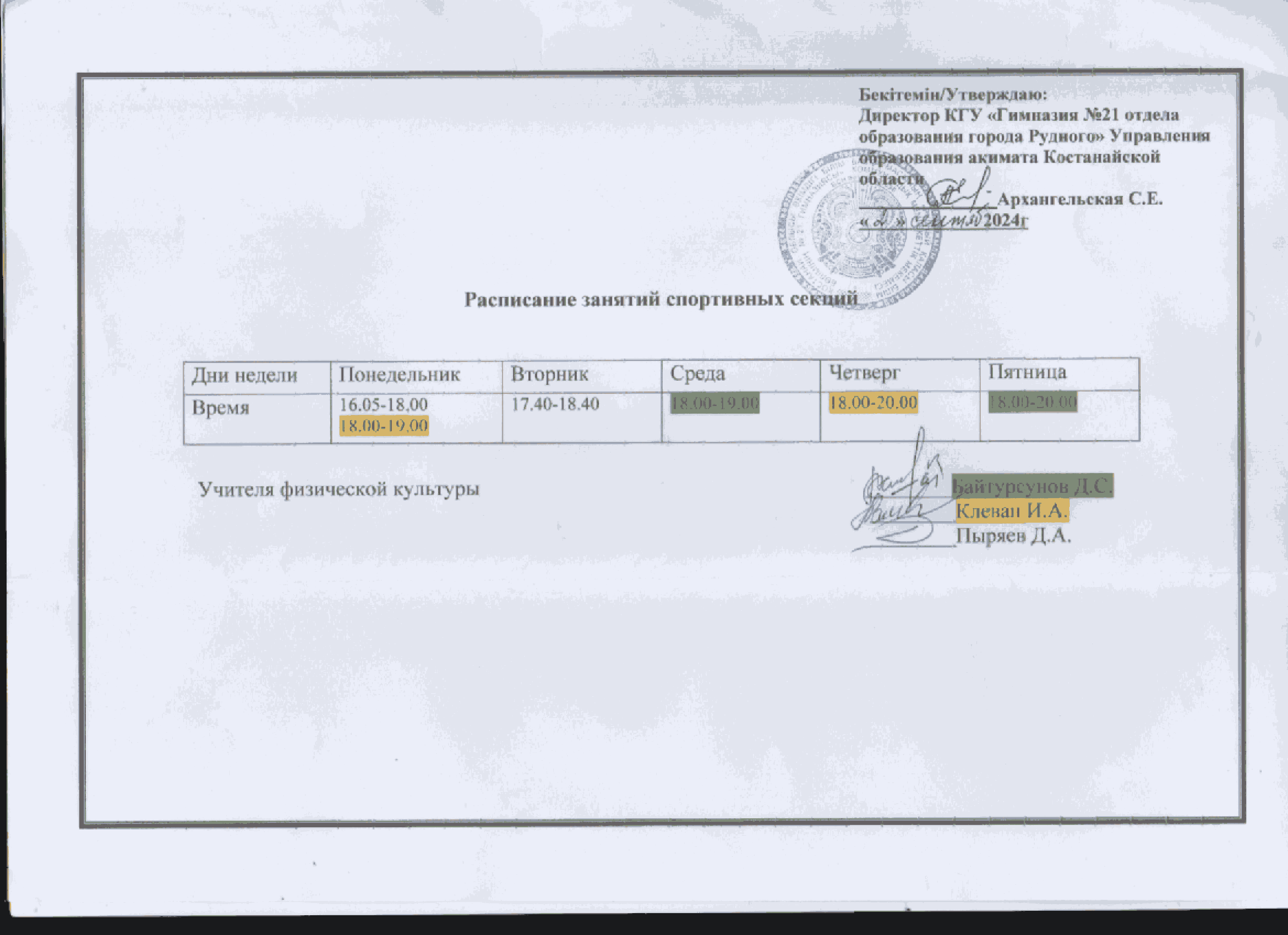 Расписание спортивных секций на 2024 - 2025 учебный год