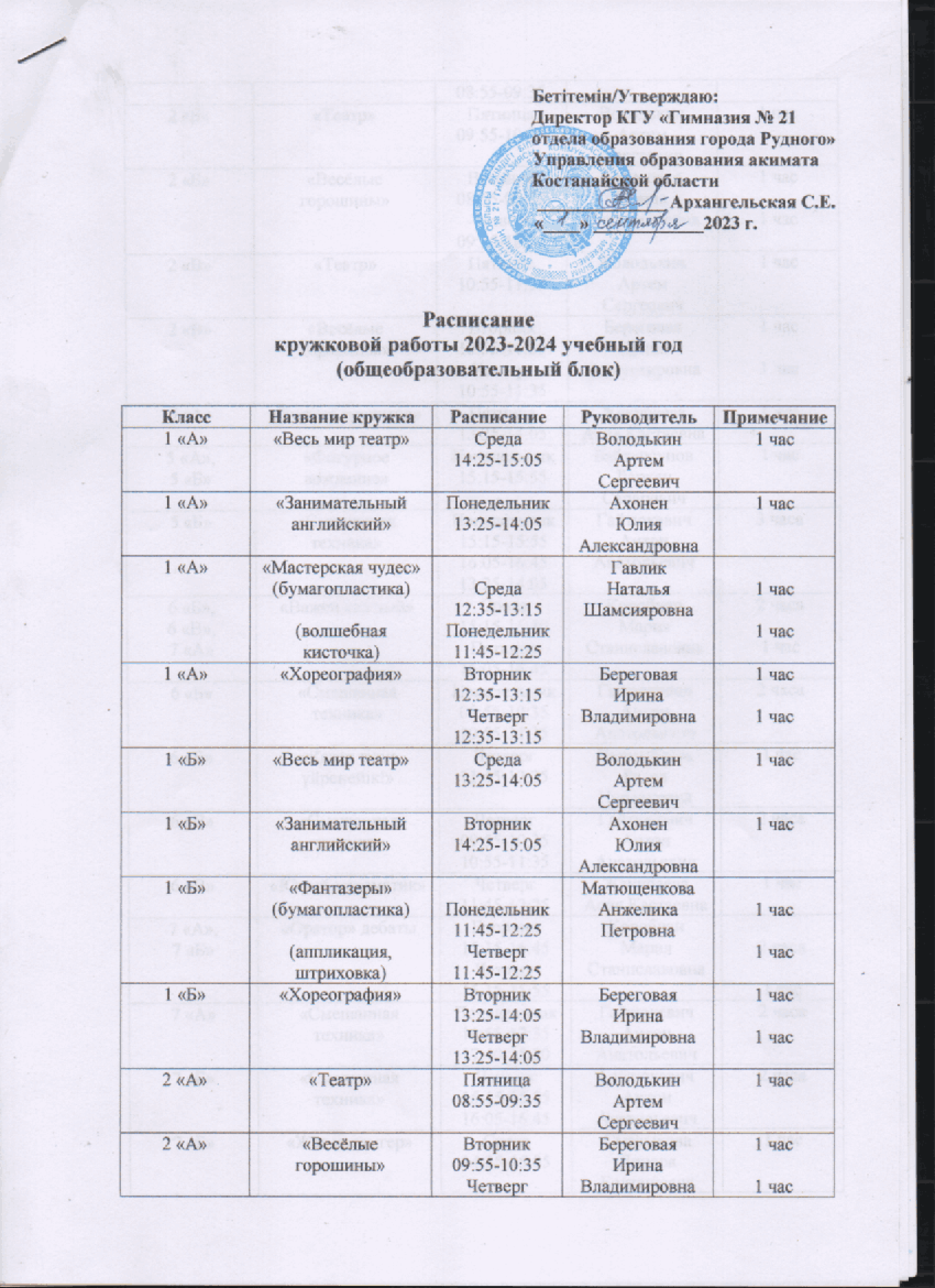 Расписание кружковой работы 2021 - 2022 уч. год. (общеобразовательный блок)
