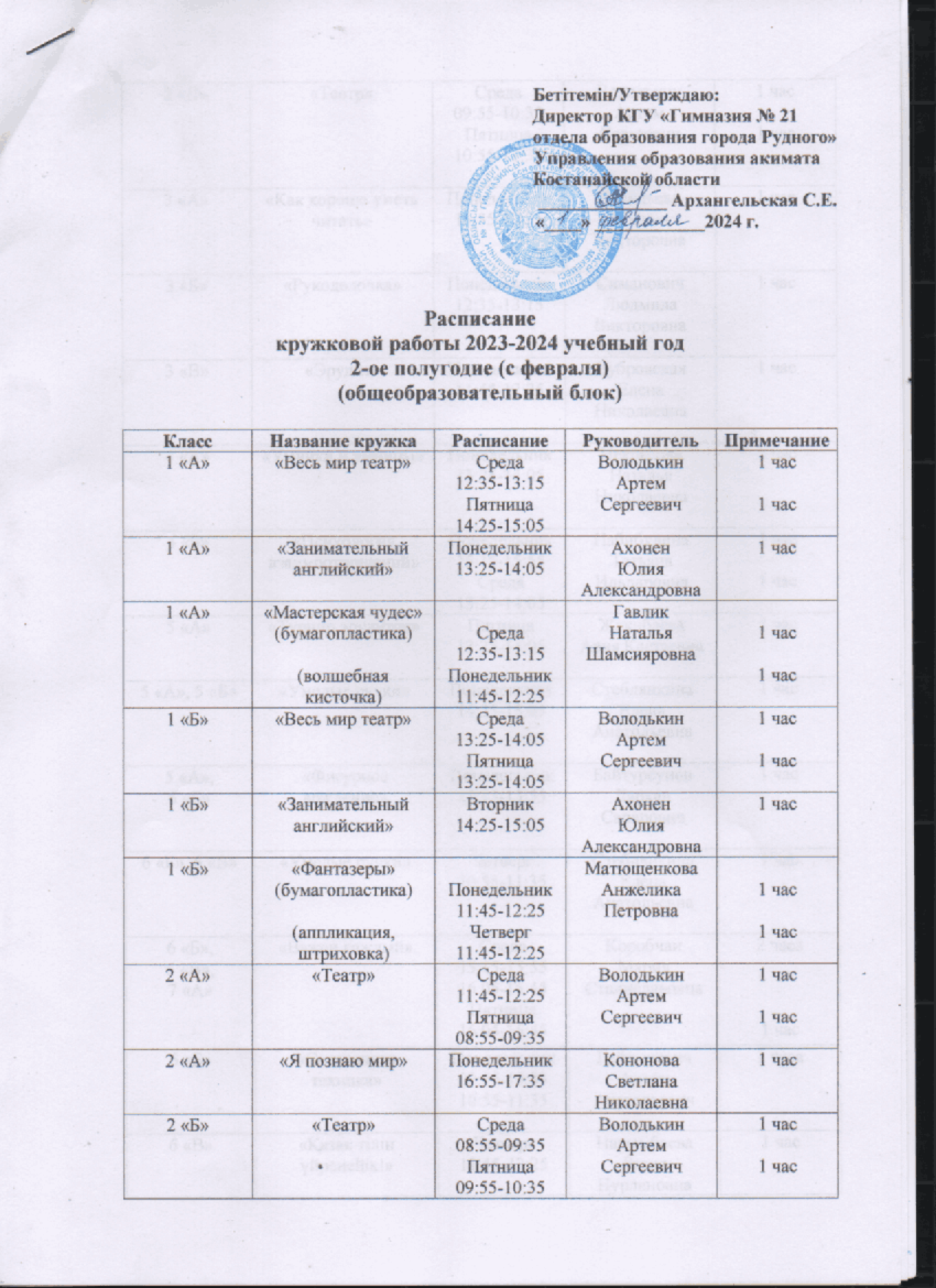 Расписание кружковой работы на 2 полугодие 2023 - 2024 учебного года