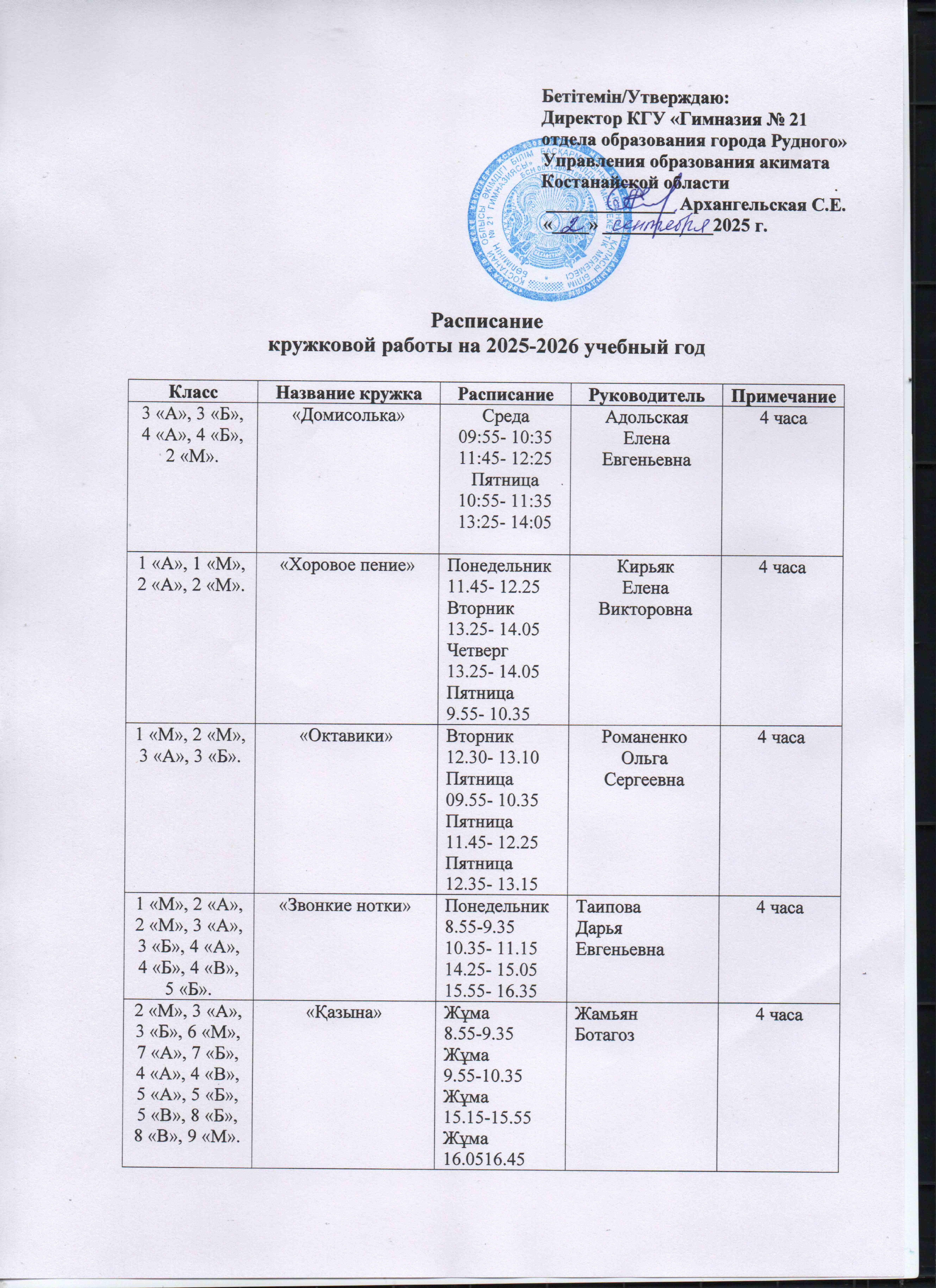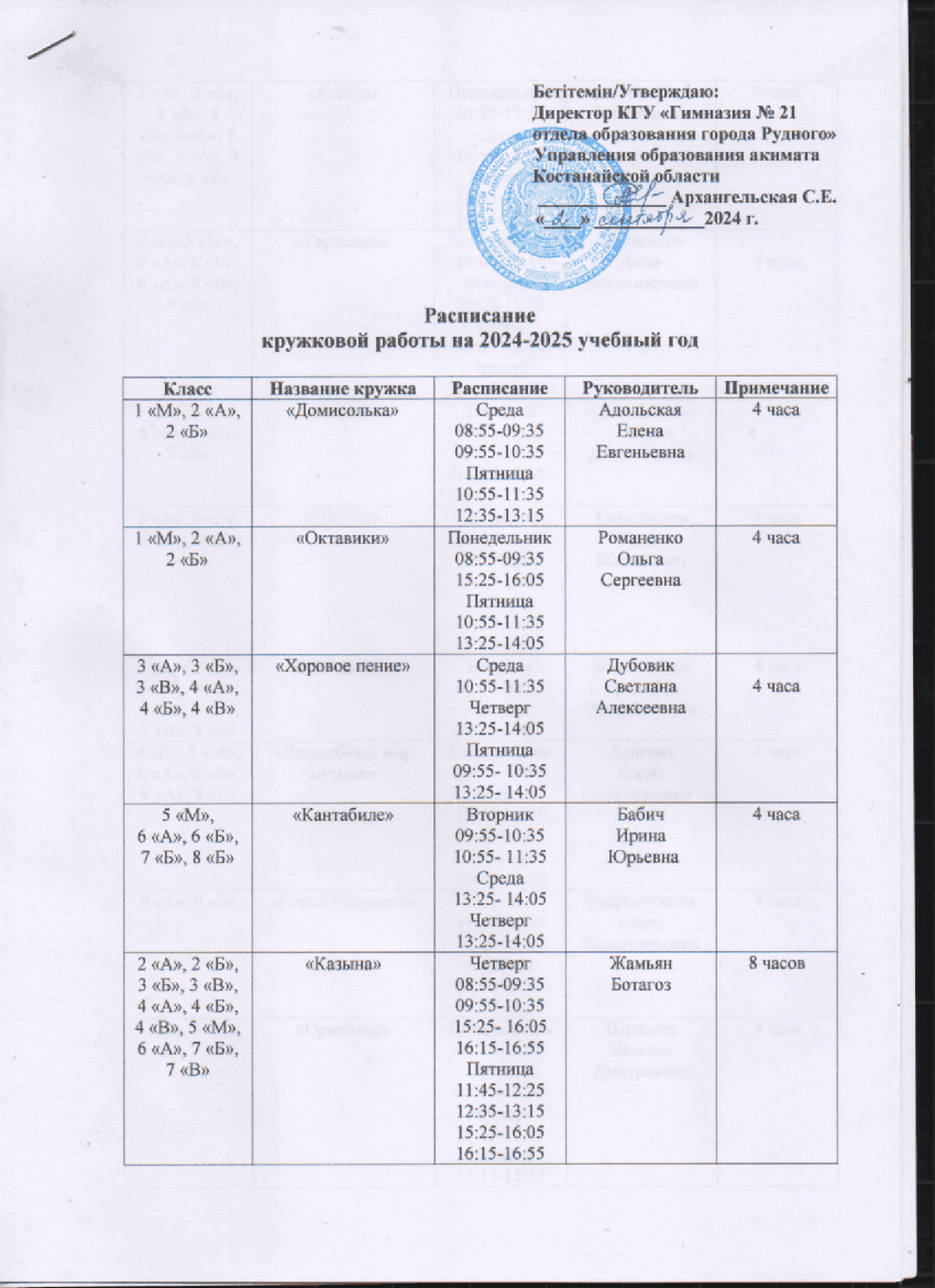 Расписание кружковой работы на 1 полугодие 2024 - 2025 учебного года