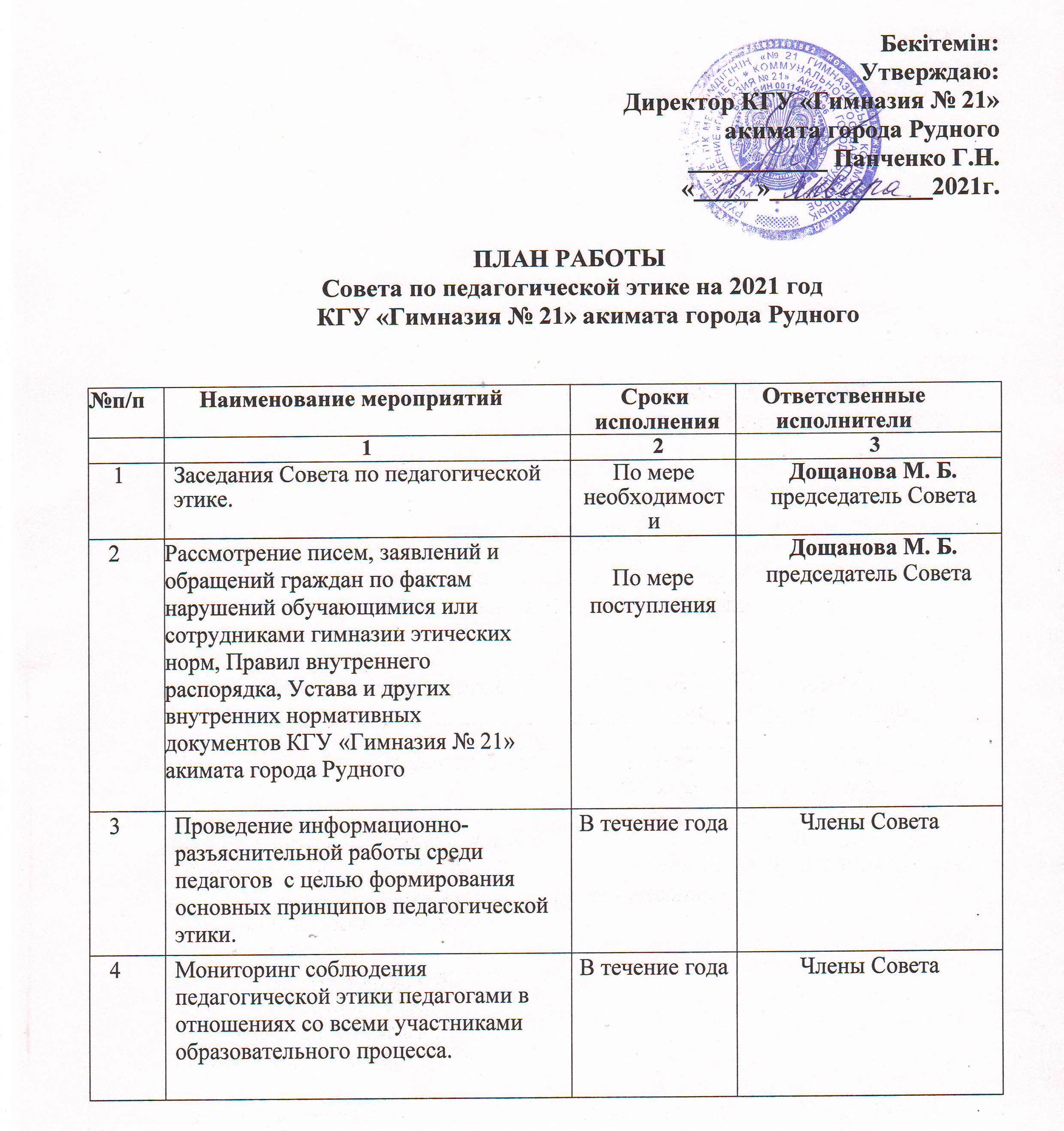 План работы Совета по педагогической этике