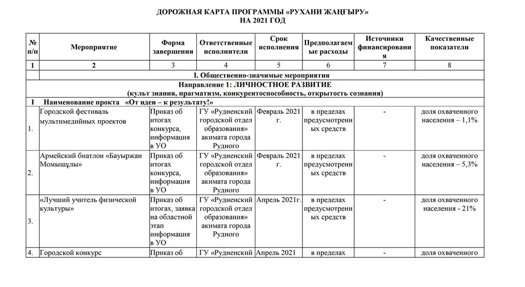 • Дорожная карта программы «РУХАНИ ЖАҢҒЫРУ» на 2021 год