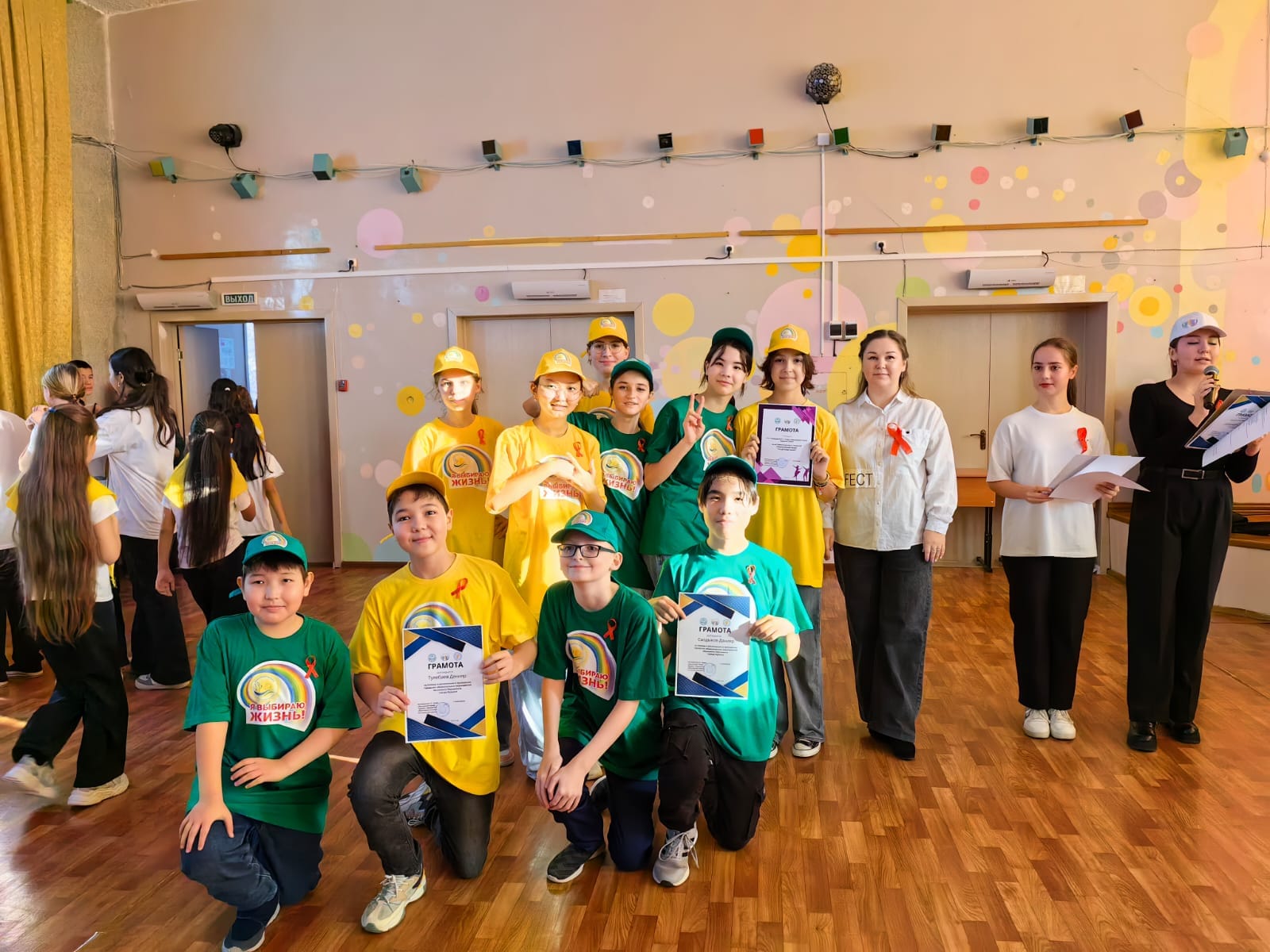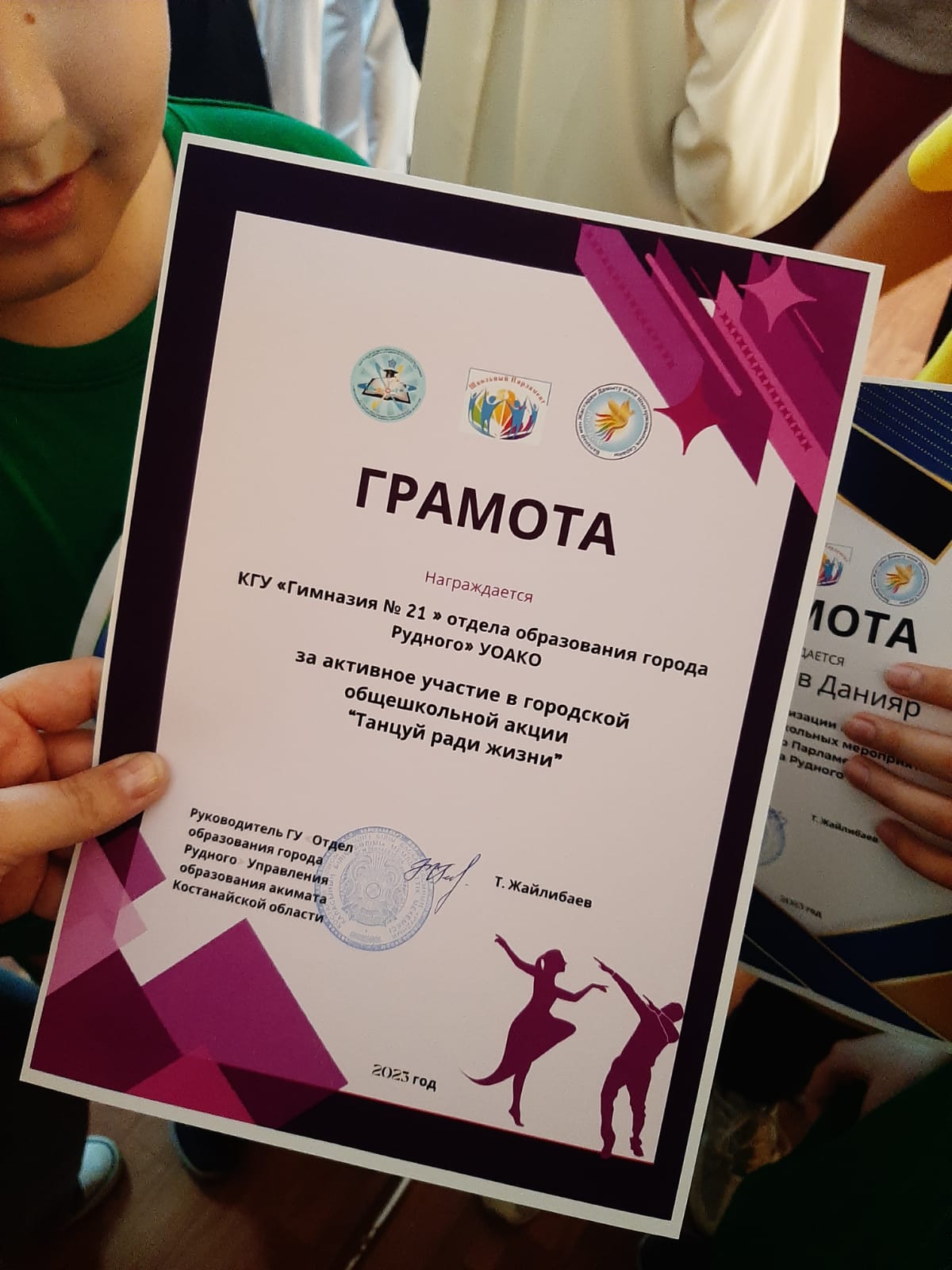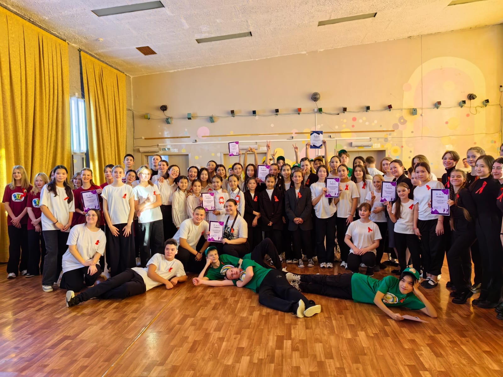 1 декабря во дворце развития и творчества состоялась акция "Танцуй ради жизни", посвящённая ВСЕМИРНОМУ ДНЮ БОРЬБЫ СО СПИДОМ. В акции приняли участие учащиеся 7 "Б" класса. По окончанию акции все школы, принявшие участие, были награждены грамотами отдела образования города Рудного. Сыздыков Данияр и Тулебаев Данияр также награждены грамотами за помощь в организации и проведении городских общешкольных мероприятий школьного парламента города Рудного.
