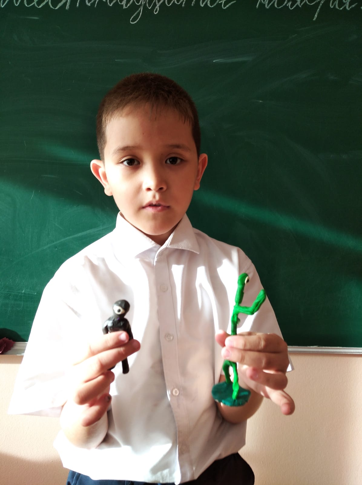 Аблайханов Аят, учащийся 4 "Б" класса. Аят любит лепить из пластилина и мастерит поделки из бумаги. Он ответил на вопросы одноклассников по организации места и времени для поделок и провел мастер-класс по изготовлению когтей.
