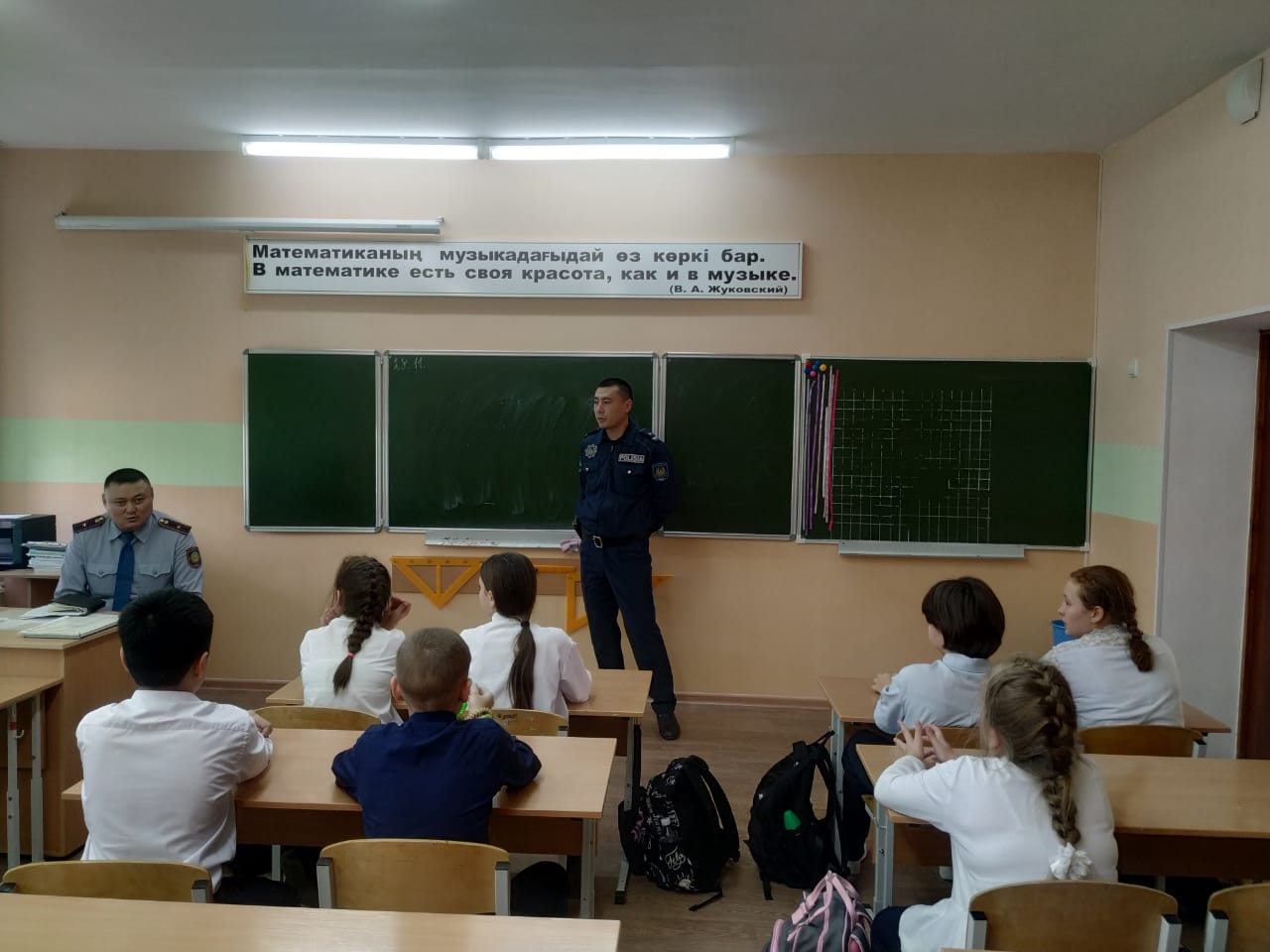 28.11.2023г начальник ИВС г.Рудного майор полиции Нурекин Нұрлан Бейсенбайұлы, старший участковый полиции Ережеп Арслан Сәкенұлы провели профилактические беседы с учащимися 5 «А», 5 «Б» и 7 «Б» классов на тему: «Права и обязанности несовершеннолетних», «Ответственность несовершеннолетних и их родителей за совершенные правонарушения» с разъяснением норм административного и уголовного законодательства РК.