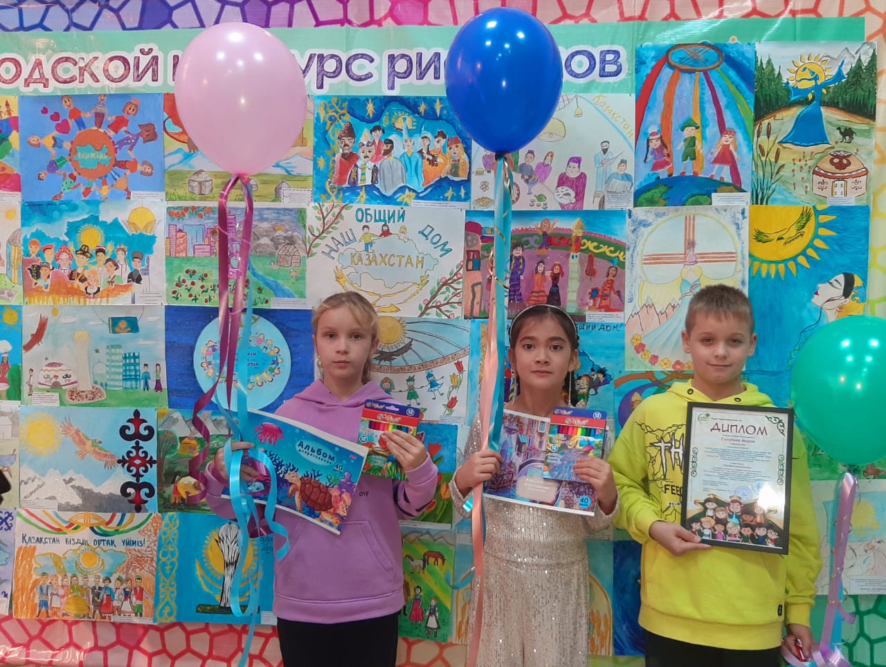 12 ноября состоялась церемония награждения победителей городского конкурса детского рисунка "Казахстан- наш общий дом". Среди числа победителей были и наши гимназисты. Голубков Мирон, Белисарова Камила и Гладышева Ангелина были награждены подарками и яркими шарами! Голубков Мирон также был награждён дипломом победителя городского конкурса. Поздравляем наших победителей, желаем дальнейших побед и благодарим организаторов конкурса ОФ "Счастье в нас"!